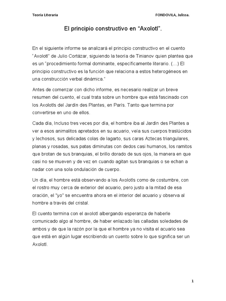 El cuento termina con el ajolote albergando esperanza de haberle comunicado algo al hombre de haber enlazado las calladas soledades de ambos y de que la razn por la que el hombre ya no visita el acuario sea que est en algn lugar escribiendo un cuento sobre lo que significa ser un Axolotl. 2015 Anlisis de Axolotl por Julio Cortzar Axolotl es un cuento corto escrito por Julio Cortzar en 1954. A partir de la aplicacin del modelo de Genette se analizan las relaciones entre binomios espacio-tiempo uno-diverso.