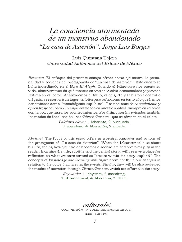 La historia se public por primera vez en 1947 en la revista literaria Los Anales de Buenos Aires y se volvi a publicar en la coleccin de cuentos de Borges El Aleph en 1949. El cuento que decid analizar es La casa de Asterin.